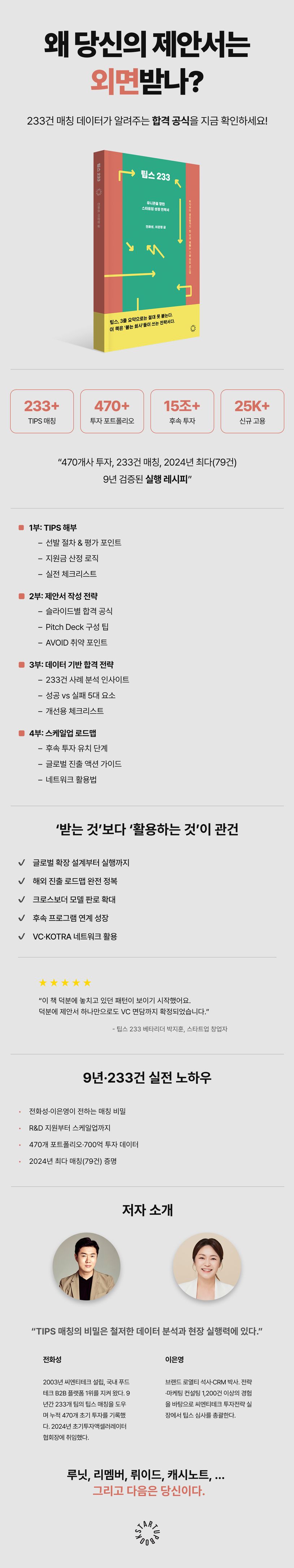 창업 7년 이내 기술 기반 스타트업, R&D 팀 리더, 액셀러레이터 담당자라면 반드시 곁에 두어야 할 실전 지침서. 팁스를 기점으로 스케일업과 유니콘을 향해 나아가고 싶은 창업자에게 결정판이 될 것이다.