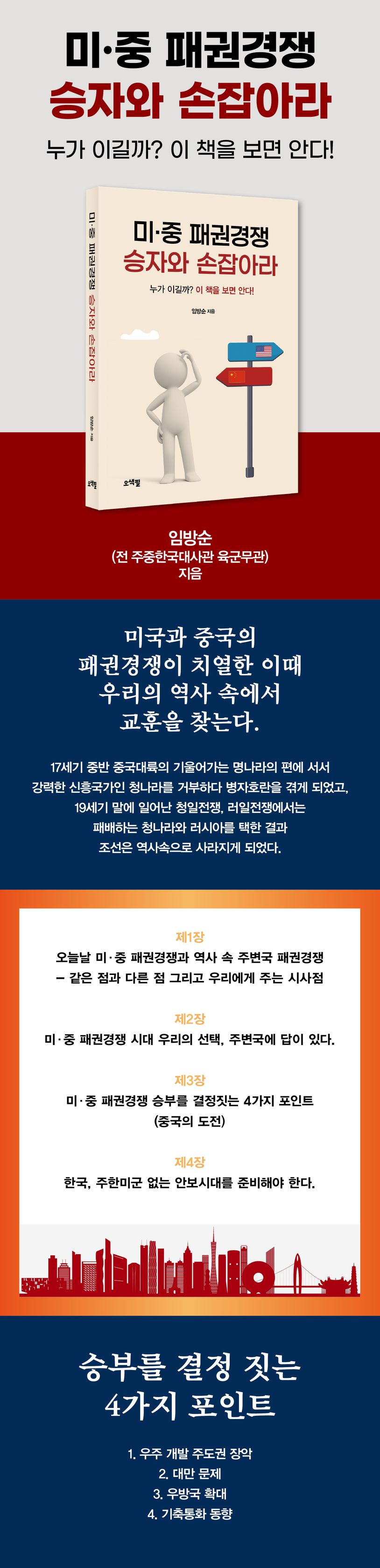 이 책 〈미·중 패권경쟁 승자와 손잡아라〉의 저자 임방순은 역사에는 가정이 있을 수 없다고 전제하면서도 수시로 “~했다면”을 꺼내 들어 우리의 앞날을 예시하고 있다. 이 책의 부제인 “누가 이길까? 이 책을 보면 안다”에는 더욱 그의 나라 사랑이 묻어난다. 그는 “고종의 선택은 최악이었다”며 청일전쟁 후 러시아가 남하하면서 조선이 다시 러시아와 일본의 대결장이 되었을 때 고종이 패배하는 러시아를 택한 걸 탄식한다. 일본이 영국과 미국 등 해양세력을 대리하여 러시아와 대항하고 있는 현실을 꿰뚫어 보지 못했다는 것이다.
