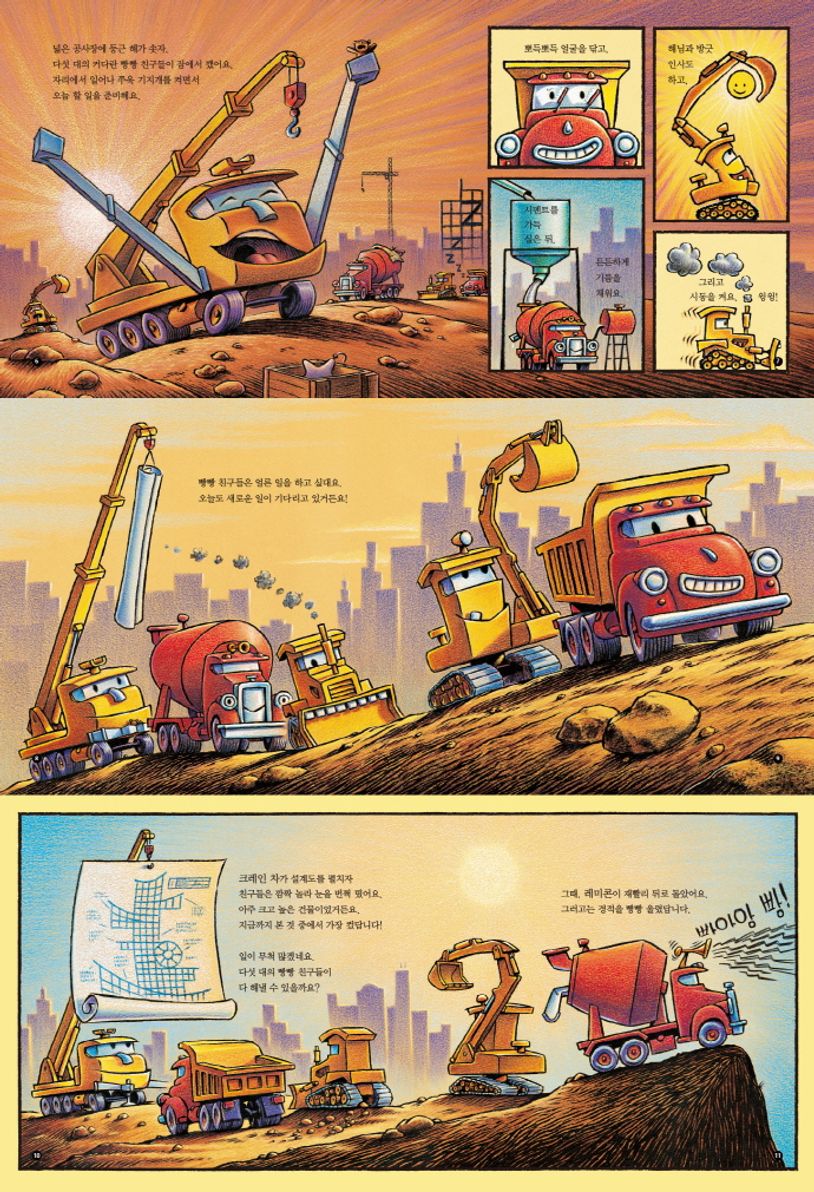 커다란 공사장에 아침 햇살이 비추자, 다섯 대의 빵빵 친구들이 잠에서 깼어요!