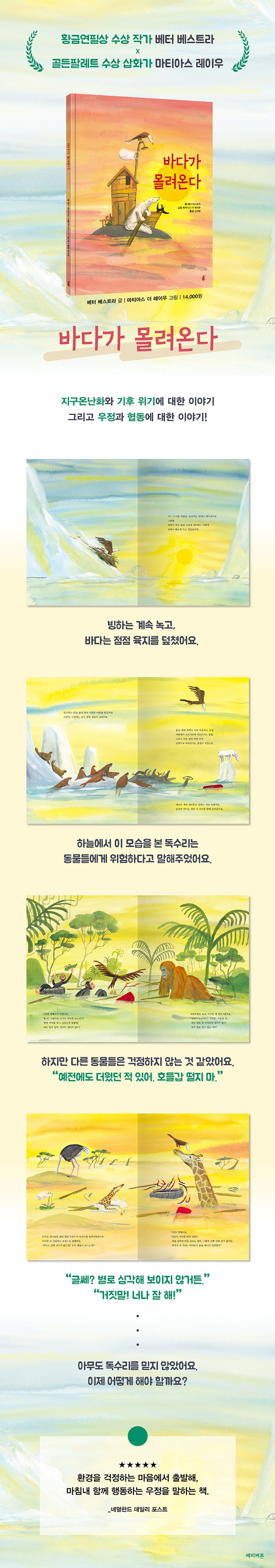 하지만 독수리를 믿어주는 동물은 없습니다. 누군가는 당장의 상황이 심각하지 않아 보인다고, 누군가는 눈앞에 보이지 않으니 믿을 수 없다고, 누군가는 이전에도 이런 적이 있었으니 엄살피우지 말라고, 또 다른 누군가는 괜한 논란을 만들지 말라고 하지요. 독수리는 잠시 좌절하지만, 이윽고 함께 행동할 북극곰과 펭귄을 만나게 되고 다른 동물들을 구하기 위한 더 큰 날갯짓을 시작합니다.
