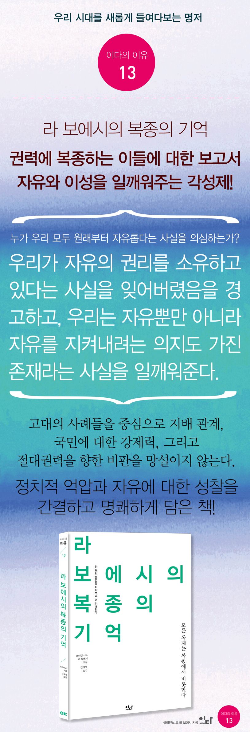 ‘책 한 권의 운명은 저자보다 더 위대하다’라는 말이 있다. 시대를 움직인 책은 당대를 뛰어넘어 이후 역사의 시금석이자 버팀목으로 자리한다. 이에 이다북스는 우리 시대를 새롭게 들여다보는 숨어 있는 명저를 ‘이다의 이유’로 출간한다. ‘이다의 이유 13’ 《라 보에시의 복종의 기억》은 자유란 무엇인지 진진하게 고민하면서 독재에 복종하는 이유를 밝히고 어떻게 해야 자유를 되찾을 수 있는지 말한다.
