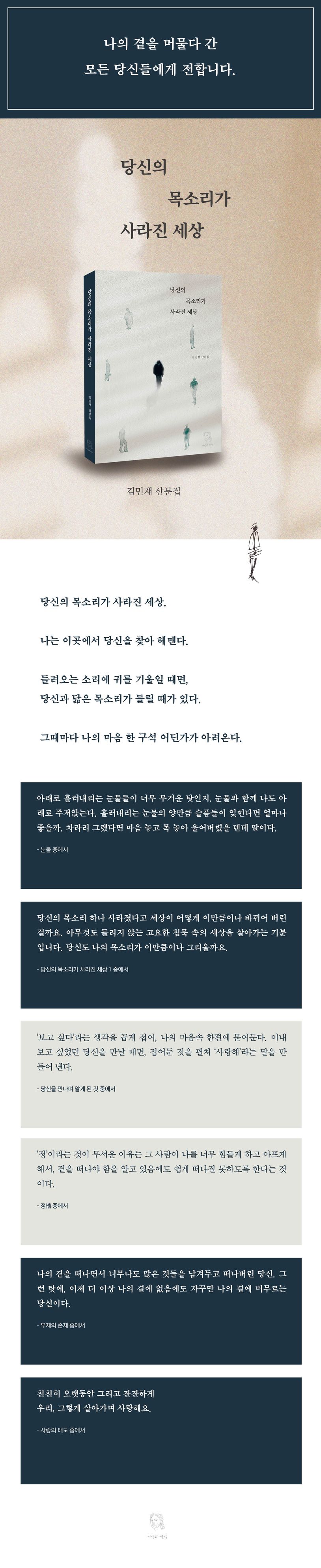 살아가다 보니 사라지는 사람들이 너무나도 많아지는 삶이다. 나의 곁에서 ‘당신’이라는 이름으로 머물다 사라지는 사람들. 나의 곁을 머물다 간 가족, 친구, 애인 등의 모든 ‘당신’들에게 조심스레 전해봅니다. 나의 곁을 떠난 후, 당신은 지금 어떻게 살아가고 있나요. 당신의 목소리가 사라진 세상은 많은 것이 변했습니다. 당신에게도 ‘나’라는 사람이 한 명의 ‘당신’으로 기억되어 있을까요. 부디 이 글이 나의 곁을 떠난 당신에게 한 번쯤은 닿을 수 있기를 바랍니다.