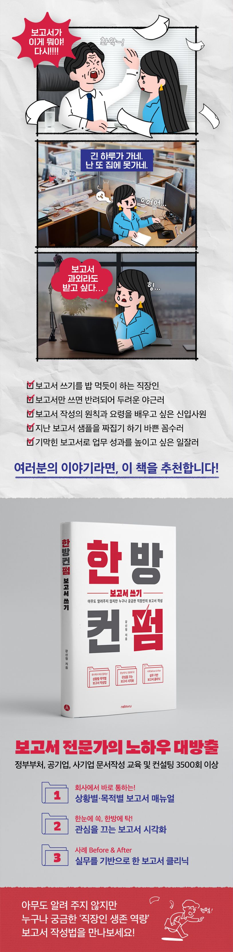 ‘이번주까지 보고서 작성해 오세요!’ 상사의 지시에 눈앞이 하얘지면서 무엇부터 어떻게 써야 할지 막연한 사람들을 위해 준비했다. 그동안 아무도 자세하게 알려주지 않았지만, 꼭 알고 있어야 하는 보고서 작성법의 모든 것! 상황과 목적에 맞는 보고서를 구성하는 방법부터 관심을 이끌 수 있는 보고서 시각화 디자인 구성법, 실전에 써먹을 수 있는 프레젠테이션 스킬까지. 《한방컨펌 보고서 쓰기》 한 권이면 우리는 자신감 있게 완벽한 보고서를 작성해낼 수 있을 것이다.