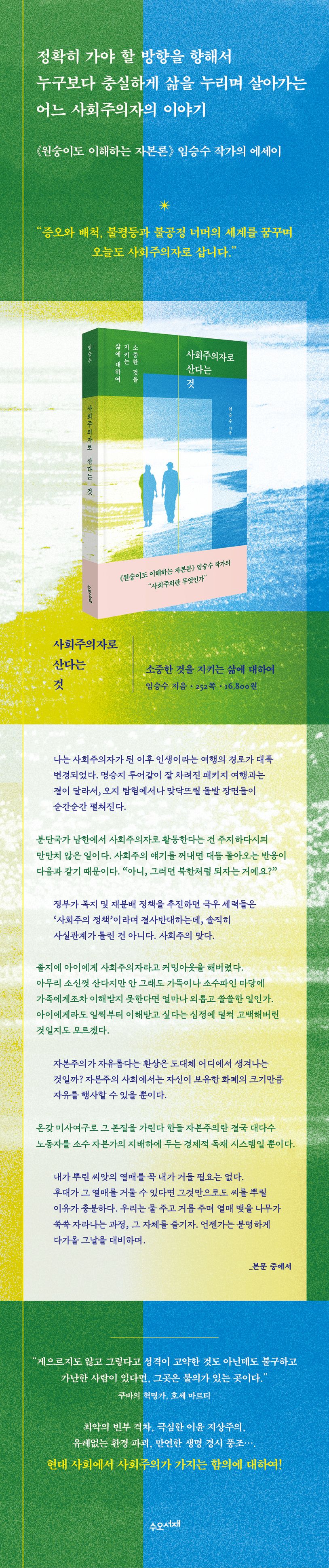 사회주의로의 강요는 없다. 다만 질문이 시작될 뿐이다. 최악의 빈부 격차, 극심한 이윤 지상주의, 유례없는 환경 파괴, 만연한 생명 경시 풍조가 지배하고 있는 이 땅에서 우리는 무엇을 소중하게 여기며 지켜나갈 것인지. 증오와 배척, 불평등와 불공정 너머의 세계를 꿈꾸며, 우리 삶의 지표에 진중한 화두를 던진다.