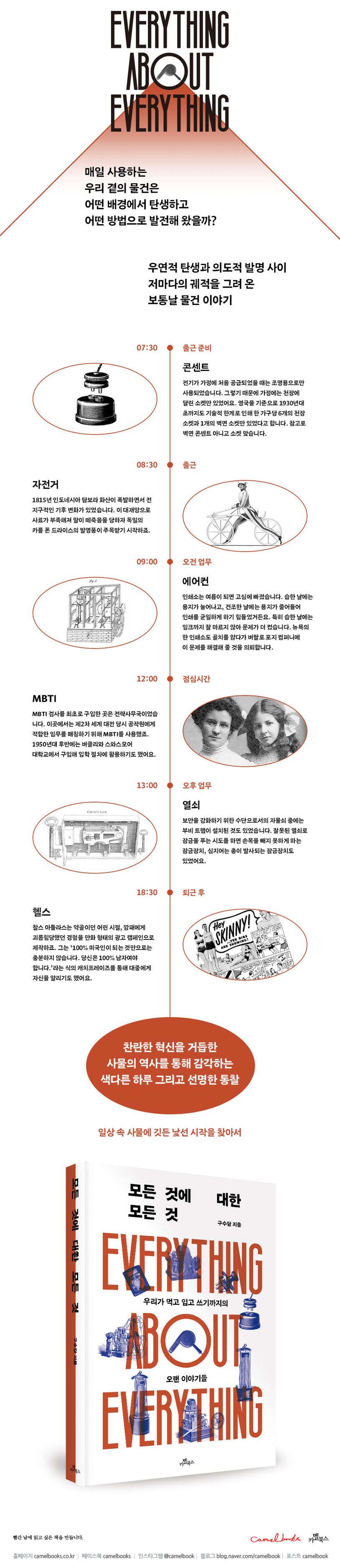 물건은 우연적으로 탄생하기도 하고, 필요에 의해 발명되기도 한다. 그리고 끊임없이 발전을 거듭하기도 하며 다양한 이유로 소멸의 길을 걷기도 한다. 『모든 것에 대한 모든 것』은 주변 모든 것들의 역사를 이야기한다. 아침에 눈을 뜨고 밤에 눈을 감기까지 일상에서 마주하는 순서에 따라 제시되는 물건의 면면을 읽다 보면 무심코 사용하던 물품들이 새롭게 느껴진다.