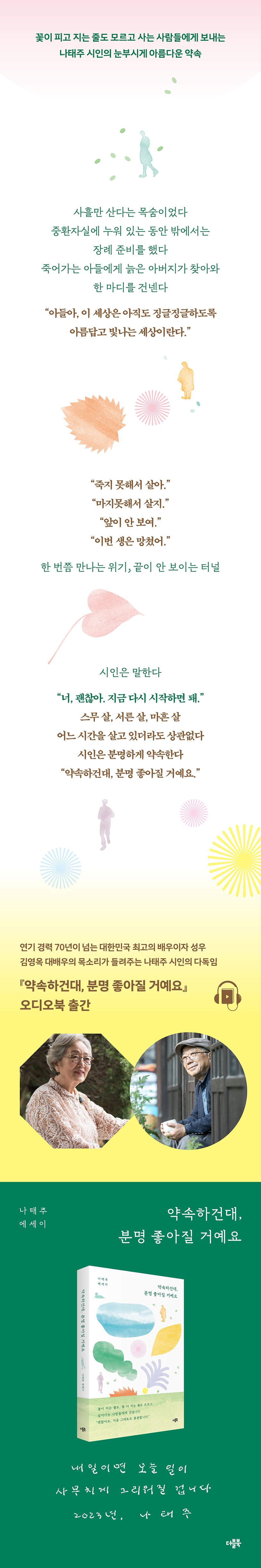 먹고 자는 사소한 일에 감사하는 일, 하늘을 보고, 비가 내리는 일에 분별없이 기뻐하는 일, 딸아이가 전화로 안부를 묻거나 아내와 동네를 산책하는 그런 순간순간에 집중하는 일……. 그러한 일을 소중하게 대하면서 나태주 시인의 삶은 기쁨과 긍정과 에너지로 넘치기 시작했다. 그 과정과 이야기가 에세이 『약속하건대, 분명 좋아질 거예요』에 오롯이 담아냈다.