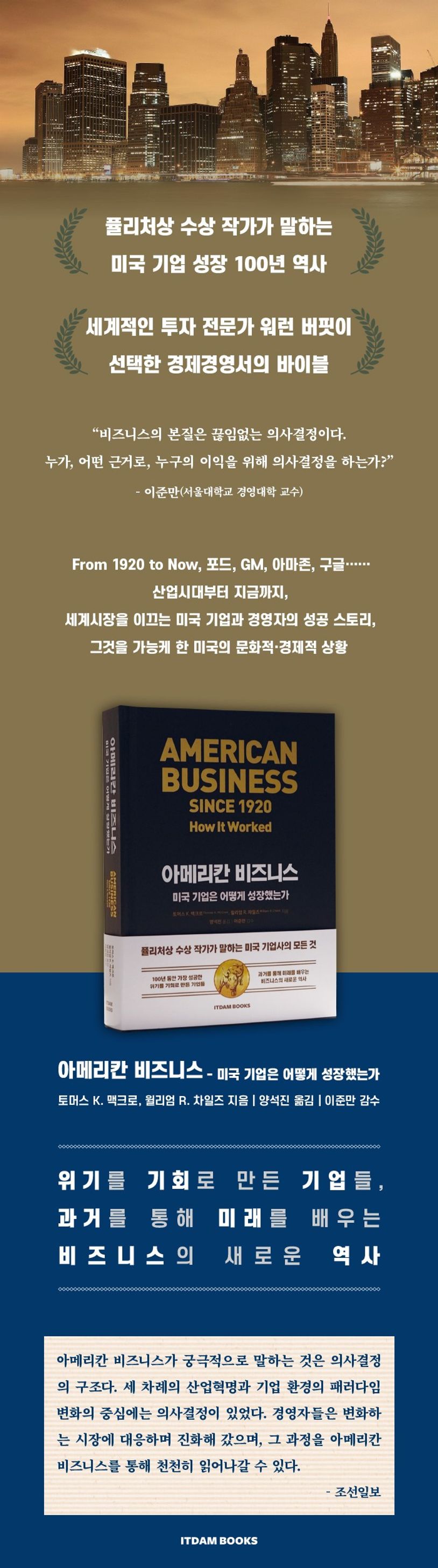세계적인 투자 전문가 워런 버핏이 그의 저서에서 자주 언급한 경제경영서인 「아메리칸 비즈니스」가 출간되었다. 이 책은 퓰리처상 수상 작가인 토머스 K. 맥크로와 오랫동안 20세기 미국과 비즈니스 역사를 연구해온 윌리엄 R. 차일즈(William R. Childs)가 대학교와 대학원에서 교재로 사용할 목적으로 쓴 것이다. 그에 걸맞게 기업 활동과 경제 현상 전반에 관해 객관적이고 통시적인 관점을 제시하고 있다. 초판이 출간된 이래 여러 번 개정판을 펴낼 정도로 미국 내에서 꼭 읽어야 할 비즈니스 관련 개론서로 알려진 「아메리칸 비즈니스」는 폭넓은 이해와 깊이 있는 분석으로 경영 체제가 변모하는 시대적 흐름과 기업 활동의 역사적 맥락을 선명하게 보여준다.