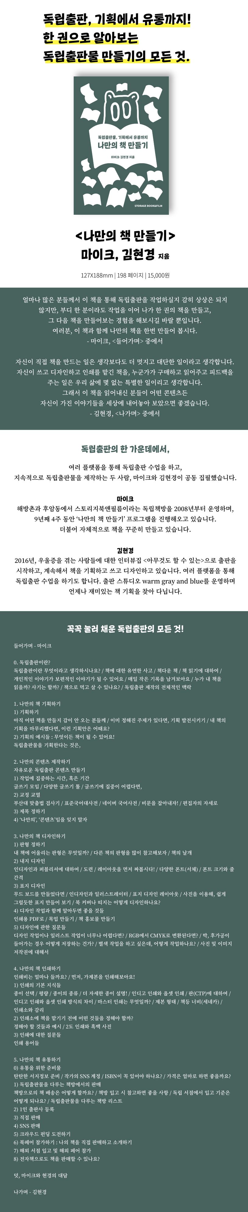 막연하고 어렵게 느껴질 수 있는 책 만들기의 기획에서부터 콘텐츠 제작, 디자인과 인쇄, 유통 방식까지 다양한 정보를 한 권에 담았습니다. ‘나만의’ 책을 만들어 보는 것이 언젠가의 소망이었다면, 이 책과 함께 지금 바로 시작해보세요.