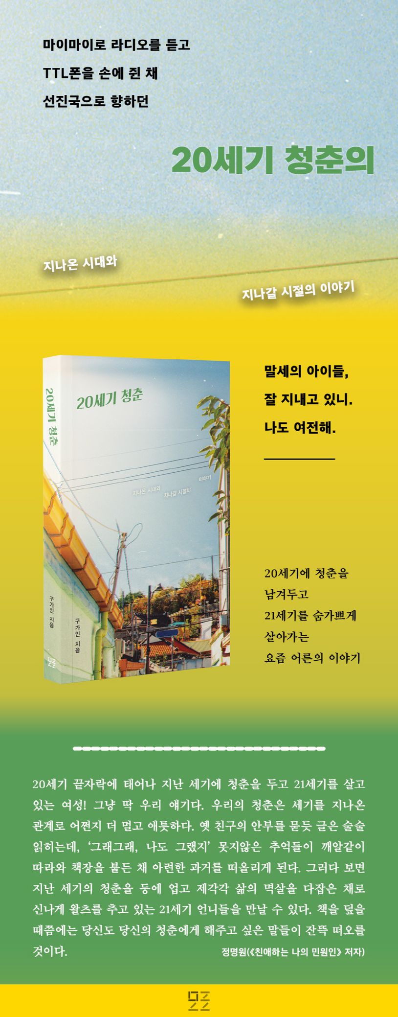 21세기를 살아가는 요즘 어른들에게도 청춘은 있었다. 20세기와 21세기, 개도국과 선진국 사이에 있던 젊은이들은 마이마이에 이어폰을 꽂은 채 라디오를 들었고 손에 쥔 “처음 만나는 자유”로 문팅을 했다. 굴렁쇠 소년을 보며 희망을 꿈꿨지만 갖은 붕괴와 IMF로 불안을 품었고 쪽수 많은 동년배와 치열한 경쟁을 해야 했다. 낙관과 좌절이 버무려졌던 20세기의 청춘들이 지나온 시대와 지나갈 시절의 이야기.