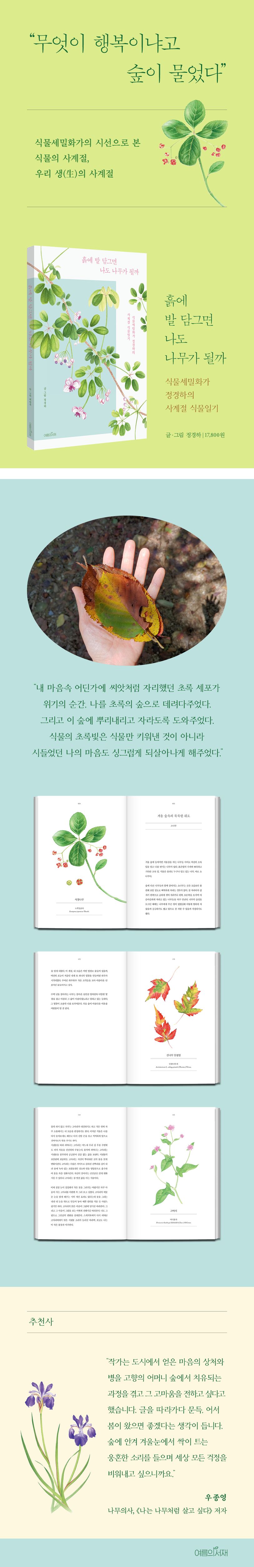 일상은 숨 가쁘다. 책상 위에서, 길 위에서 종종대다 시간에 늘 쫓긴다. 하고 싶은 것도, 할 시간도 없이 지내다 보면 번아웃이 온다. 아무것도 할 수 없을 정도로 몸과 마음이 아픈 그때, ????어떻게 살 것인가????라는 물음이 찾아온다. 식물세밀화가인 정경하는 그 해답을 숲에서 찾았다. 숲속의 생명들은 한 뼘의 볕도 함께 나누며, 서로 기대어 살아간다. 숲에서 10여 년의 시간을 함께하며 작가는 ????겨울은 언제나 혹독하지만 지나온 겨울을 그저 힘들다고 말할 수 없음????을 깨달았다. 그 시간 동안 잠시 쉬어가기도 하고, 다시 새 힘을 얻기도 하며 나로 살아가는 법을 배웠으니 말이다. 《흙에 발 담그면 나도 나무가 될까》에는 숲에서 살며 사랑하며 얻은 자연의 ????숨????과 ????쉼????이 담겨 있다. 모든 걱정을 비워내는 시간, 한 발 더 생(生) 앞으로 나아갈 힘을 건네는 사계절 식물일기를 만나보자.