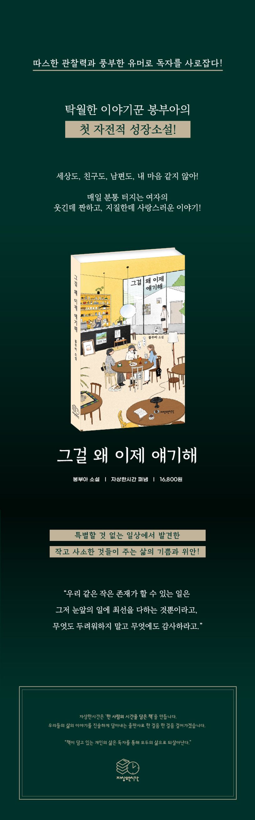 〈그걸 왜 이제 얘기해〉는 평범한 일상을 그리지만 그 안에 작고 소중한 것들이 존재한다는 것을 보여준다. 그것은 추운 겨울 트럭 장수에게서 딱히 필요하지도 않은 물건을 사는 마음일 수도, 걸음걸이만 봐도 친구의 기분이 어떤지 아는 우정일 수도, 술 먹고 들어와서 웅크려 자는 남편의 이불을 덮어주는 손길일 수도, 악행을 행하는 사람들을 향한 소심한 복수일 수도 있다. 소설은 마치 우리의 일상을 그대로 옮겨 놓은 듯 현실적이어서 나와 내 이웃들의 이야기처럼 가깝다. 또한 저자의 따뜻한 관찰력과 솔직한 속마음은 작가만의 유머와 버무려져 웃음과 감동이 가득한 한 편의 시트콤을 보는 것 같다.