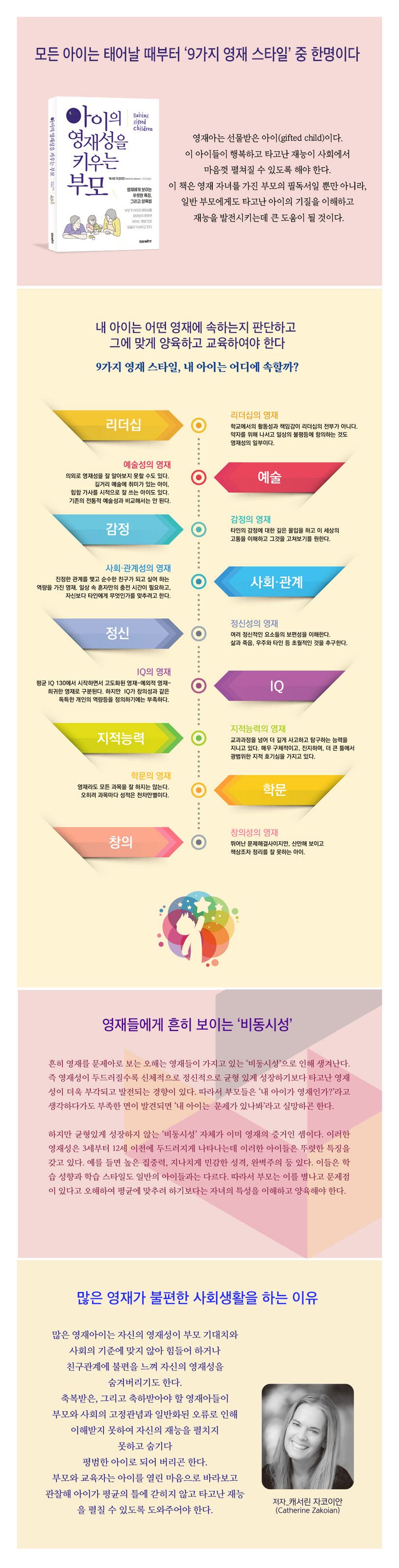영재아는 선물받은 아이(gifted child)이다. 이 아이들이 행복하고, 타고난 재능이 사회에서 마음껏 펼쳐질 수 있도록 해야 한다고 저자는 주장한다. 이 책은 영재 자녀를 가진 부모의 필독서일 뿐만 아니라, 일반 부모에게도 아이의 타고난 기질을 이해하고 재능을 발전시키는데 큰 도움이 될 것이다.