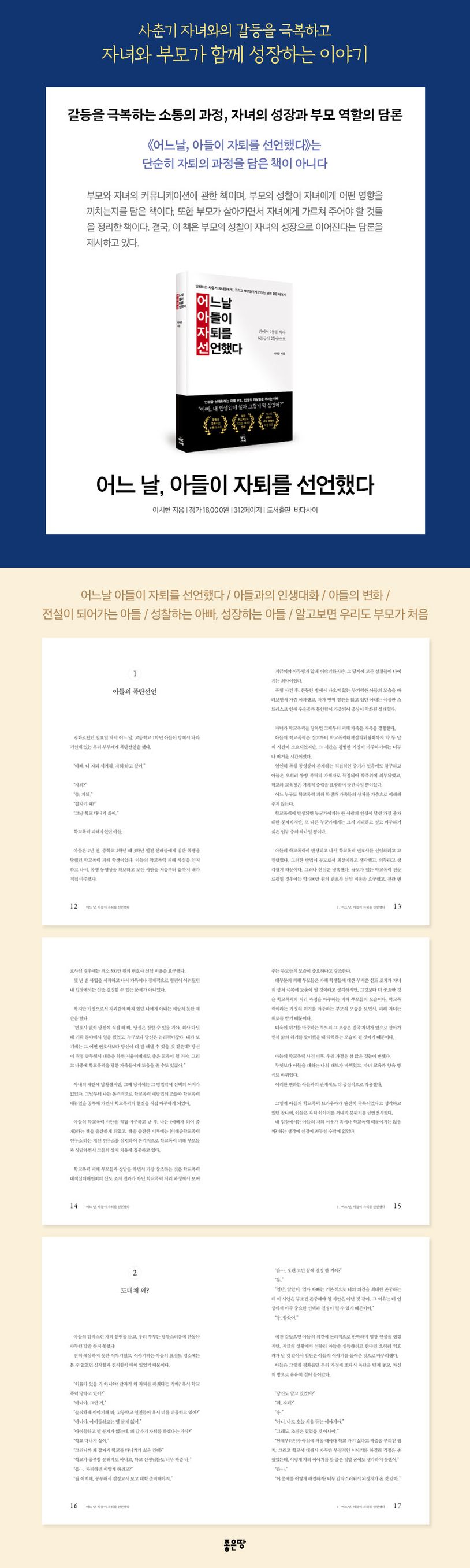 《어느 날, 아들이 자퇴를 선언했다》는 단순히 자녀와의 갈등을 극복하는 과정을 그린 책이 아니다. 부모와 자녀의 커뮤니케이션에 관한 책이며, 부모의 성찰이 자녀에게 어떤 영향을 미치는지를 담은 책이다. 또한 부모가 자녀에게 가르쳐 주어야 할 것들을 정리한 책이다. 결국, 이 책은 부모의 성찰이 자녀의 성장으로 이어진다는 담론을 제시하고 있다.