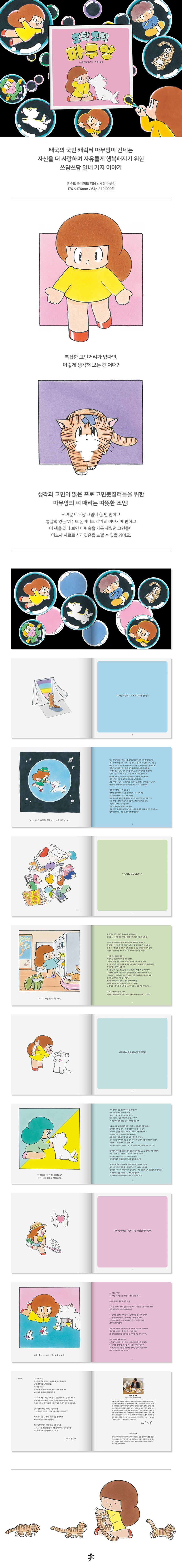 커다란 눈, 동글동글 머리, 귀엽고 솔직한 표정들. 보기만 해도 저절로 웃음이 지어지는 망고를 닮은 캐릭터 ‘마무앙(มะม่วง, Mamuang)’과 고양이, 강아지 친구들. 이 책 『토닥토닥 마무앙』은 태국 일러스트레이터 위수트 폰니미트(Wisut Ponnimit)가 탄생시킨 캐릭터 마무앙이 누구나 고민하지만 쉽게 답을 내리기 어려운 질문 열네 가지를 함께 고민하며 건네는 이야기다.