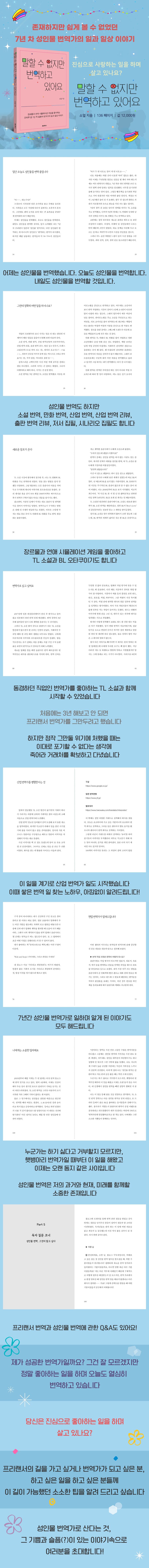 7년 동안의 경험으로 성인물 번역과 일반 번역의 다른 점을 알려주고 관련된 재미있는 에피소드도 들려준다. 번역가로 살아남기 위해 노력한 이야기도 구체적이고 솔직하게 풀어놓았다. 실제 번역 업무가 어떤 과정으로 진행되는지, 번역일을 찾는 실전 노하우에는 어떤 것이 있는지 등 번역가로 살아남기 위한 정보도 많이 알려준다. 프리랜서의 길을 가고 싶은 사람, 번역가가 되고 싶은 사람, 하고 싶은 일을 하고 싶은 사람에게 대리 만족과 위로, 이 길이 가능했던 팁을 아낌없이 알려 준다.