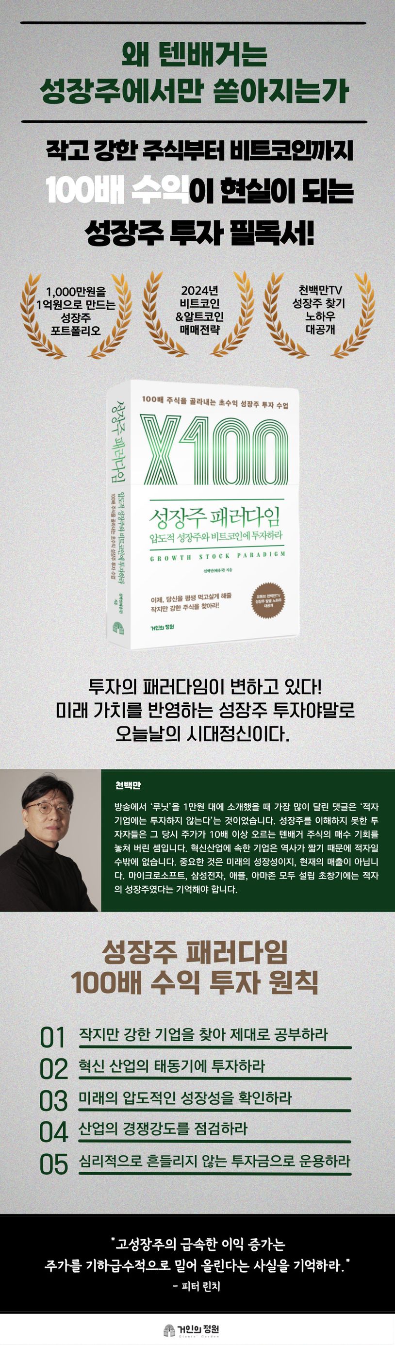 책에는 대한민국에서 성장주 투자의 선도자로 활동하고 있는 천백만(배용국)의 노하우를 담았다. 성장주의 정의, 종목 고르기, 투자 원칙, 매수매도 타이밍, 그리고 마지막으로 대세상승을 준비하는 비트코인까지 수십 년간 쌓은 인사이트를 아낌 없이 나눈다. 특히 초창기 루닛(1만 3천원대), 레인보우로보틱스(3만 2천원대) 등을 발견한 실제 노하우를 밝히며 개인투자자들이 경제적 자유에 한발짝 더 다가갈 수 있도록 돕는다.