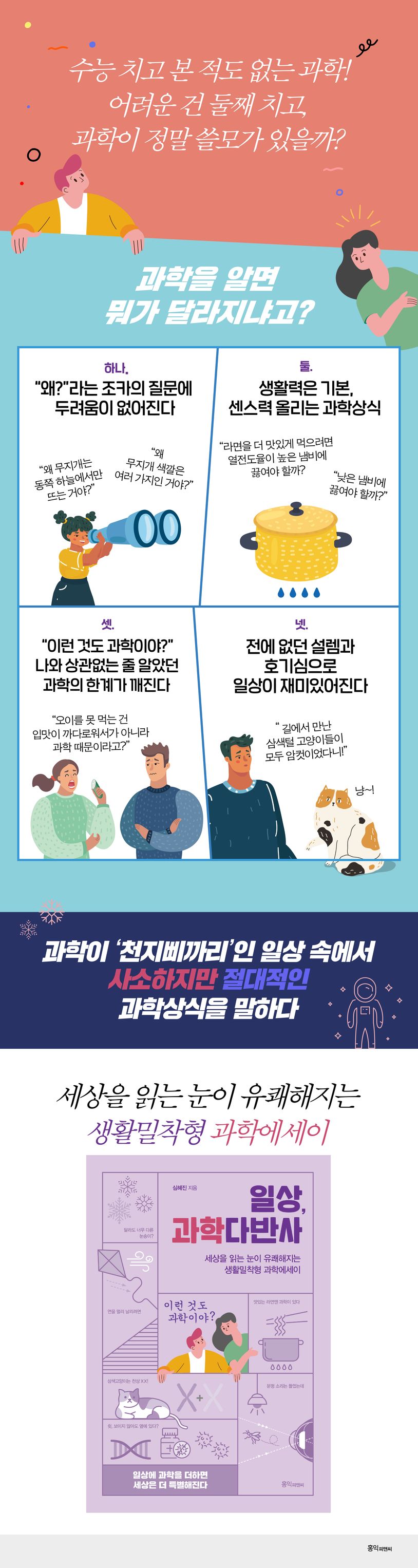 내 일상에 영향을 주는 사소하지만 절대적인 과학상식일상을 둘러싼, 알고 보면 대단한 과학 이야기에 빠져 보자 늘 남의 얘기처럼 느껴지는 과학을 알면 뭐가 달라질까? 《일상, 과학다반사》는 과학에 대한 두려움보다 그 쓸모에 의문을 가진 당신을 위한 책이다. 무심코 보내는 일상 속에 얼마나 많은 과학이 숨어 있는지, 현실 문제를 해결하는데 과학이 얼마나 유용한지 알려준다. 어린 조카가 묻는 천진난만한 질문에도 술술 답하게 만드는, 세상 읽는 눈이 밝아지는 과학책이다. 저자는 익숙한 일상 속에서 56가지 과학적 통찰을 끄집어낸다. 살이 찌면 왜 배부터 나올까? 추운 날 왜 휴대폰은 금세 꺼질까? 길에서 만난 삼색고양이는 왜 대부분 암컷일까? 저자는 궁금하지만 차마 묻지 못하고 얼버무렸던 질문들을 과학으로 풀어내며 사소한 과학상식이 때로는 평범한 일상을 특별하게 만들어준다는 사실을 깨닫게 한다.