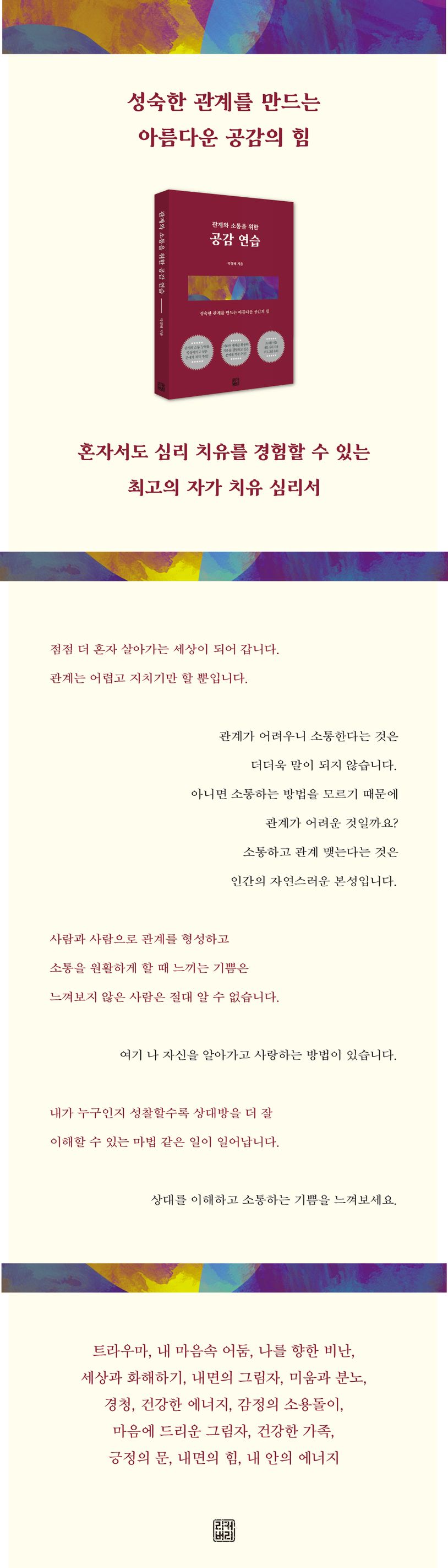 저마다 자연스러운 감정과 느낌을 자유롭게 소통할 수 있지만, 따뜻하고 온화한 사랑이 유지될 때 그 긍정성 속에서 각자가 행해야 할 목적대로 살아갈 수 있을 것입니다. 각자의 내면에 있는 ‘마음의 빛’은 우주의 에너지와 소통하며, ‘마음의 빛’을 찾아가는 것은 아름다운 삶을 위한 궁극적인 행로라고 할 수 있습니다. 인간관계와 의사소통에 관한 여러 책이 있지만, 이 책은 특히 ‘인문’과 ‘예술’의 감성과 감수성으로 접근한 특이한 책입니다. 시와 소설과 그림, 음악과 영화가 어우러져서 문화와 예술의 향기를 은은하게 풍겨내고 있습니다. 이러한 방식은 통합 예술·문화치료인 심상시치료 기법이 포함된 치유 비평이며, 치유 비평은 매체 속에서 긍정 에너지를 포착하여 치유적 시각으로 접근하고, 치유 기법을 제시한 비평을 일컫습니다. 이 방법을 통해 내 마음을 공감하고 더 나아가 타인을 향한 공감을 연습할 수 있습니다. 그 연습을 통해 더 나은 인간관계와 성숙한 소통을 삶속에서 이루어내기를 간절히 바랍니다.