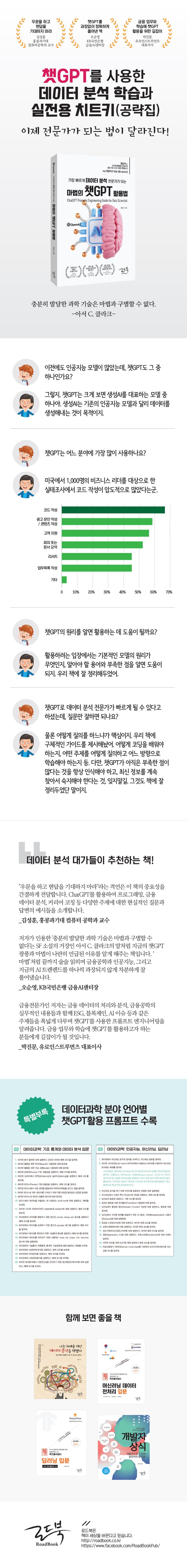 이 책은 챗GPT를 활용하여 데이터 분석 언어를 학습하고, 코딩 실전에 활용하여, 커리어 코칭을 받아 가장 빠르게 데이터 분석 전문가가 될 수 있는 방법을 알려준다. 또한, 코딩 실전에서는 코드 작성, 데이터 전처리, 코드 자동 완성, 코드 설명, 코드 변환, 코드 최적화, 코드 디버깅, 단위 테스트, 감성 분석, 기술 문서 작성 등 챗GPT를 활용하여 다양하게 코딩에 사용할 수 있는 방법을 소개하고 있다. 특별부록으로 데이터 과학 분야 언어별 챗GPT활용 프롬프트를 수록하였다.