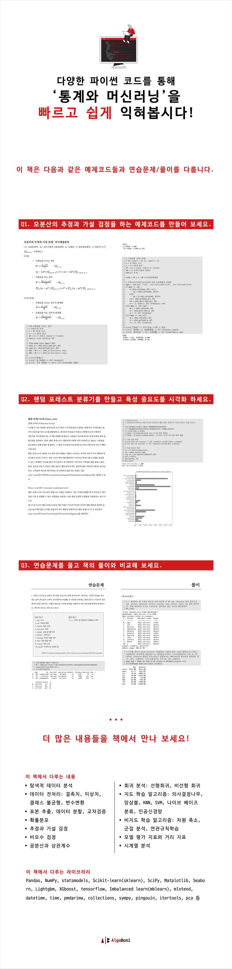 이론적인 설명은 최대한 간략하게 소개하는 한편, 파이썬 코드를 통해 각종 개념들을 이해하고 다양한 알고리즘으로 모델을 구현하는 방법을 익히는 것에 중점을 두었다. 이 때문에 책의 분량의 상당 부분을 파이썬 예제 코드를 담는 것에 할애하였다. 또한, 각 학습 주제 별 연습문제를 통해 공부한 내용을 복습할 수 있다.