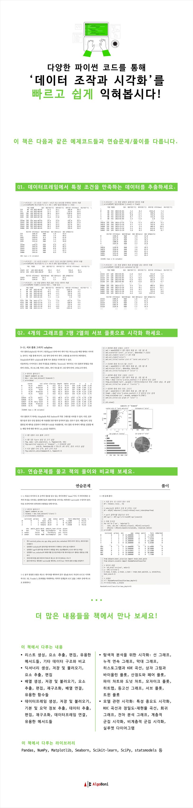 먼저 〈1부 데이터 조작〉에서는 파이썬의 주요 자료 구조인 리스트, 배열, 딕셔너리, 데이터프레 임을 다루는 법을 배운다. 각 자료 구조를 생성하고, 특정 자료를 추출 및 편집하는 방법과 해당 자료 구조에서 유용하게 사용되는 주요 함수들과 메서드들을 살펴본다. 이로써 파이썬의 다양한 자료 구조들로 된 데이터를 분석자의 필요에 따라 자유자재로 조작할 수 있게 되기를 기대한다. 다음으로 〈2부 데이터 시각화〉에서는 파이썬의 대표적인 시각화 라이브러리인 Matplotlib와 Seaborn을 기반으로 탐색적 데이터 분석을 위한 시각화와 모델 관련 시각화를 다룬다. 이론적인 설명은 최대한 간략하게 소개하는 한편, 파이썬 코드를 통해 데이터를 조작하고 시각화 하는 방법을 익히는 것에 중점을 두었다. 이 때문에 책의 분량의 상당 부분을 파이썬 예제 코 드를 담는 것에 할애하였다. 또한, 각 학습 주제 별로 공부한 내용을 복습할 수 있도록 다양한 연습문제와 풀이를 제공하고 있다.