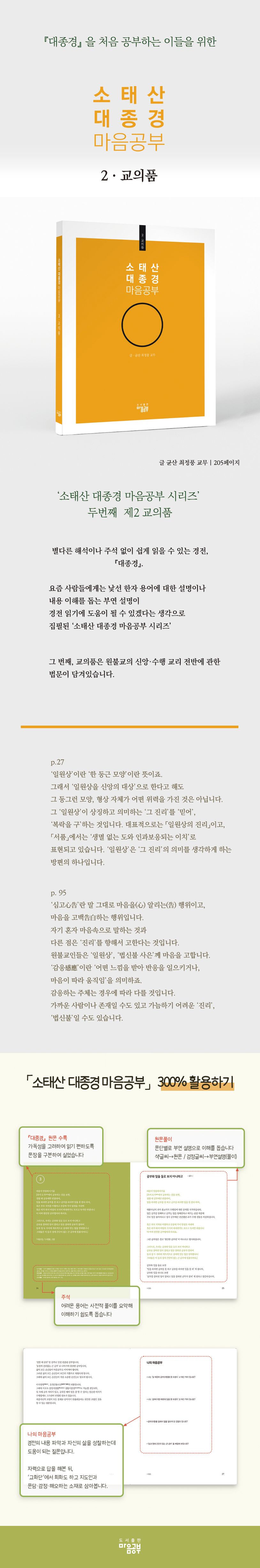 어려운 용어에 대한 사전적 풀이, 원문에 대한 필자의 부연 설명, 경전 내용의 실생활 활용에 방점을 둔 질문들로 구성되어 있습니다. 자신의 삶을 성찰해야만 응답할 수 있는 질문에 응답하는 과정에서 공부가 깊어지기를 바랍니다. 이 작은 책이 소태산 대종사의 마음공부를 하는 데 겨자씨 만한 도움이라도 되기를 간절히 소망합니다.