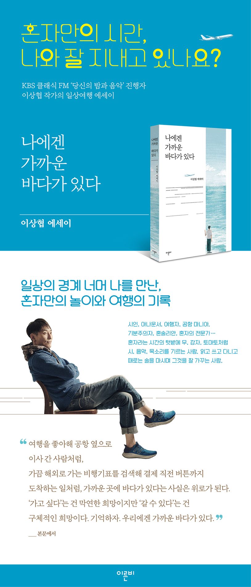 언제부터인가 쉬는 법을 잊고 사는 우리에게 그는 ‘혼자가 되어 놀아보라’고 말한다. 혼자일 때 우리는 내가 무엇을 원하는지 묻고 답하며 자신을 발견하게 된다. 혼자 있는 것은 ‘또 다른 나’를 불러내는 일이기도 하다. 6부로 구성된 이 책에서 작가는 다채로운 혼자의 모습을 보여준다. 시인과 아나운서는 물론 산책자, 연주자, 혼술족, 비행기 마니아에 이르기까지 그는 수많은 나를 불러내 새로운 시간과 공간으로, ‘가까운 바다’로 자신을 데리고 간다.
