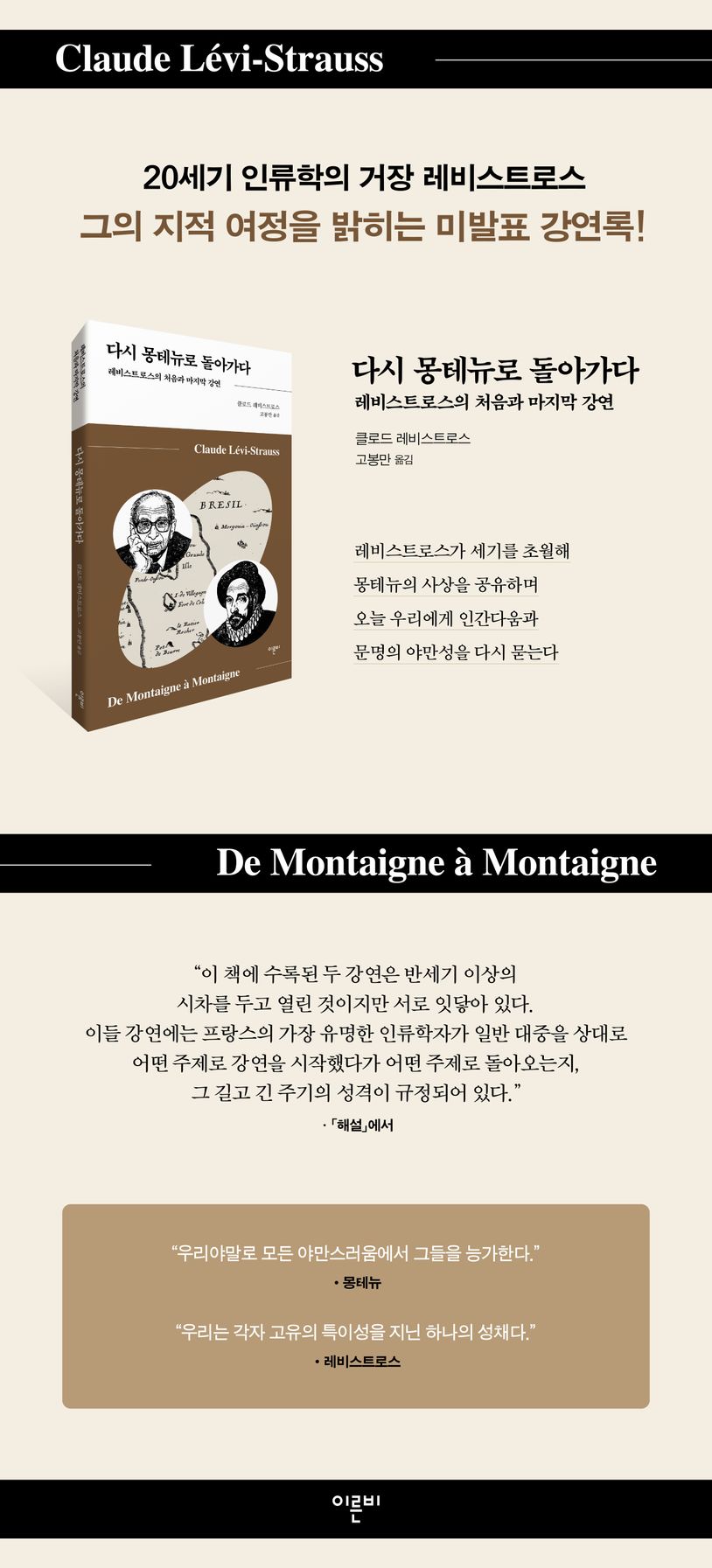 이 책은 프랑스의 저명한 인류학자이자 민족학자인 클로드 레비스트로스(1908~2009)가 남긴 두 편의 미공개 대중강연을 엮은 것이다. 첫 번째는 브라질 내륙의 원주민 사회를 탐사하던 젊은 시절에 한 1937년 1월 강연이고, 두 번째는 구조주의를 유행시키고 20세기 서구 지성사의 거목이 된 노년 시절에 한 1992년 4월 강연이다. 반세기 이상의 시차를 두고 열린 것이지만 서로 잇닿아 있다. 프랑스의 인문주의자 몽테뉴를 직간접적으로 다루기 때문이다.