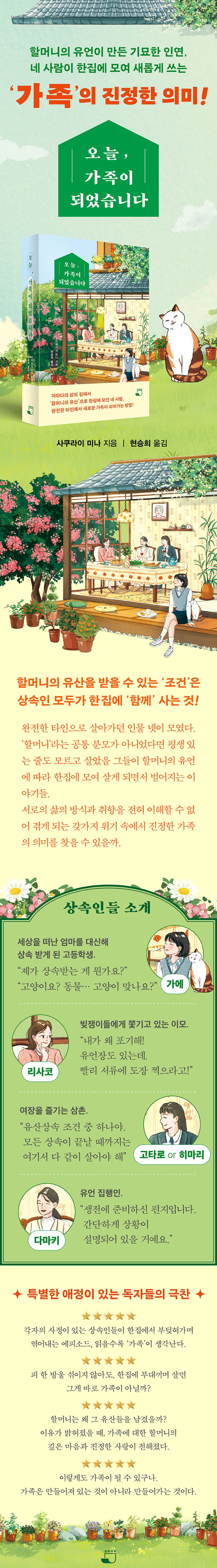 〈오늘, 가족이 되었습니다〉는 돌아가신 할머니의 유산을 상속받기 위해 뿔뿔이 흩어져 살고 있던 네 명의 가족 구성원이 한 집에 살게 되면서 벌어지는 때로는 좌충우돌, 때로는 따뜻한 에피소드를 그린 소설이다. ‘상속을 받으려면 상속인들이 모두 한 집에 살아야 한다’는 할머니의 유언에 담긴 비밀, 그리고 이 조건에 당혹스러워하면서도 후회로 가득했던 자신들의 과거와 마주하며 진정한 가족의 의미를 깨달아가는 상속인들의 이야기를 따뜻하게 그려낸다.