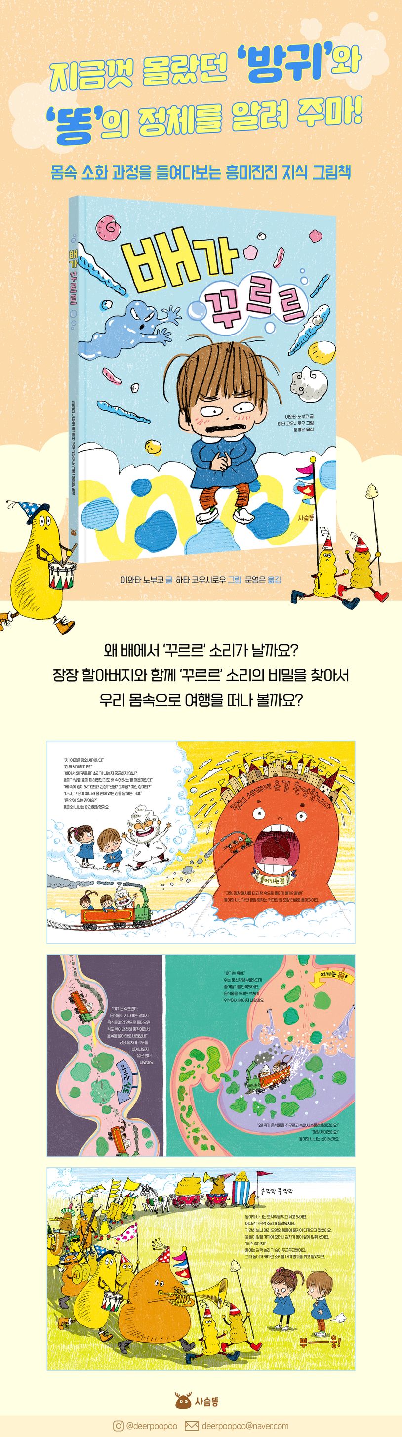 우리 배 안에서 무슨 일이 일어나고 있길래 ‘꾸르르’ 소리가 나고 배가 아픈 걸까요? 《배가 꾸르르》는 우리가 먹은 음식물이 소화되는 과정을 재미있게 알려 주는 지식 그림책입니다. 음식물이 입 안으로 들어와 식도와 위를 지나 소장과 대장을 거쳐 음식물 찌꺼기인 똥으로 만들어지기까지의 과정을 몸속 기차 여행으로 보여 줍니다. 여러 소화 기관들이 줄지어 있는 신비로운 몸속 터널을 지나면서 음식물의 소화 과정을 자연스럽게 익히게 하지요. 또한 배에서 왜 ‘꾸르르’ 소리가 나는지, 긴장하면 왜 방귀가 나오는지 같은 신체의 비밀을 알려 주고 장을 튼튼하게 만드는 체조, 동물들마다 장의 길이가 다른 까닭 등 장에 관한 여러 가지 궁금증에 한 걸음 더 다가가게 합니다. 아이들이 좋아하는 ‘똥’과 ‘방귀’가 만들어지는 흥미롭고 알찬 이야기를 익살맞은 그림으로 만나 보세요.