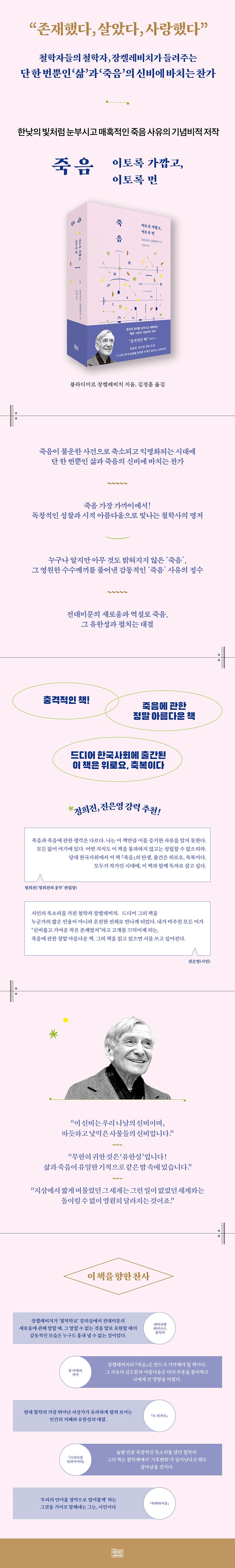 이 책은, “존재했다, 살았다, 사랑했다”는 단 한 번의 신비로 충만한 인간 존재에 대한 각성과 발견에 대한 이야기이다. 그 신비는 바로, “우리의 나날의 신비이며, 따듯하고 낯익은 사물들의 신비”이며, ‘처음이자 마지막인’ 단 하나의 ‘죽음’이라는 신비이다. ‘노년’과 ‘죽음’에 관한 다양한 탐색의 시대에 출간된 장켈레비치의 기념비적인 저작 『죽음』은, 우리 시대 죽음 이해에 더욱 깊이 있는 본격적인 성찰의 장을 마련해 줄 것이다.