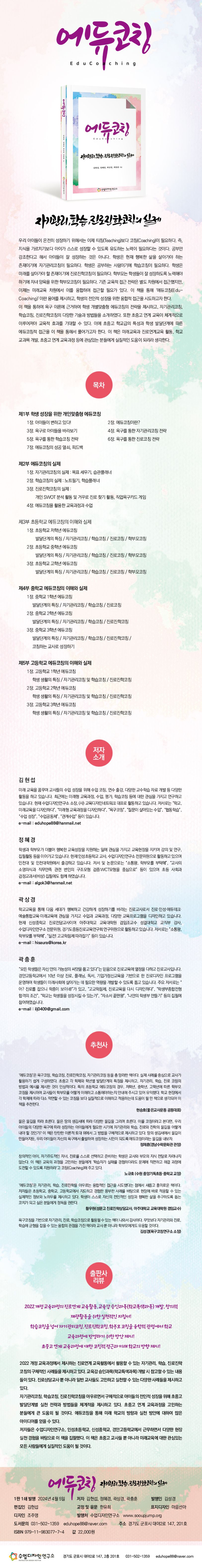 우리 아이들이 온전히 성장하기 위해서는 이제 티칭(Teaching)보다 코칭(Coaching)이 필요하다. 즉, 지식을 가르치기보다 아이가 스스로 성장할 수 있도록 유도하는 노력이 필요하다는 것이다. 공부만 강조한다고 해서 아이들이 잘 성장하는 것은 아니다. 학생은 현재 행복한 삶을 살아가야 하는 존재이기에 자기관리코칭이 필요하다. 학생은 공부하는 사람이기에 학습코칭이 필요하다. 학생은 미래를 살아가야 할 존재이기에 진로진학코칭이 필요하다. 학부모는 학생들이 잘 성장하도록 노력해야 하기에 자녀 양육을 위한 학부모코칭이 필요하다. 기존 교육적 접근 전략은 별도 차원에서 접근했지만, 이제는 미래교육 차원에서 이를 융합하여 접근할 필요가 있다. 이 책을 통해 ‘에듀코칭(Edu-Coaching)’이란 용어를 제시하고, 학생의 전인적 성장을 위한 융합적 접근을 시도하고자 한다.