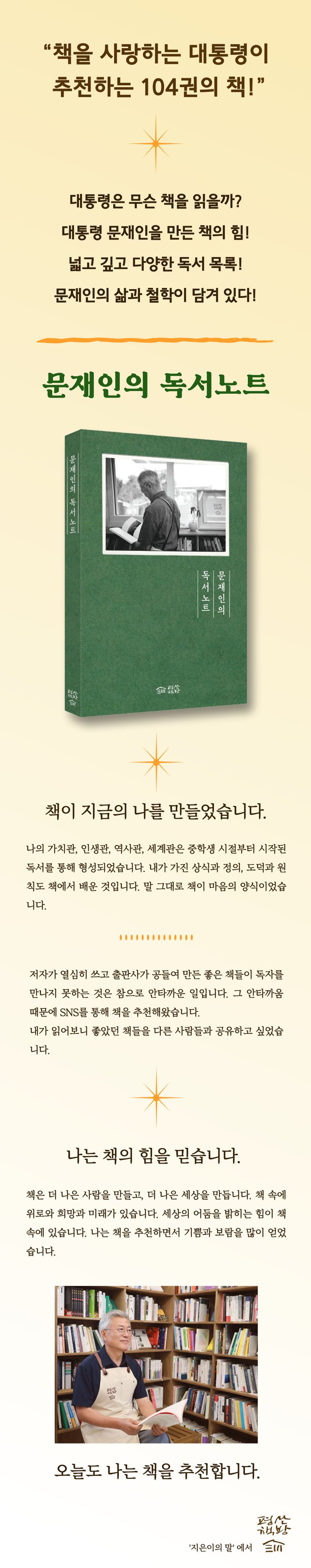 이 책은 19대 대한민국 대통령을 지낸 문재인 전 대통령의 독후감 모음집이다. 2012년 5월부터 2024년 3월까지 페이스북과 트위터에 소개한 102권의 독후감을 ‘취임 이전’ ‘재임 시기’ ‘퇴임 이후’로 나누어 담아놓았다. 뿐만 아니라 일상을 포착한 40여 장의 사진을 함께 수록하여 퇴임 대통령의 모습을 궁금해 하는 이들에게 좋은 볼거리를 제공한다.