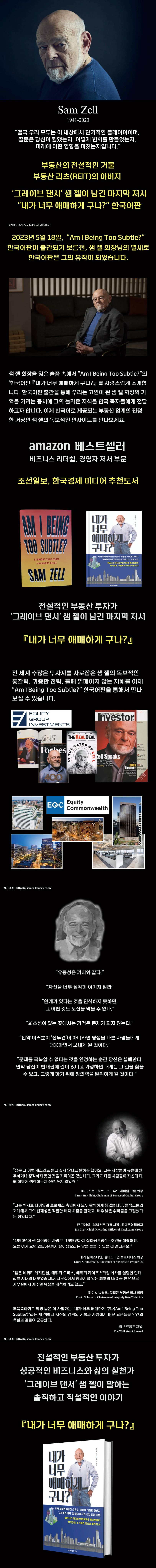 샘 젤이 요점을 강조하는 데 자주 하는 말인 “내가 너무 애매하게 구나?(Am I Being Too Subtle?)”는 이 책의 제목이며 1960년부터 현재에 이르기까지 수많은 시장 사이클을 경험하며 사업과 투자에서 얻은 경험을 이 책을 통해 공유한다. 이 책은 사업가와 투자자에게 없어서는 안 될 지침서이다.