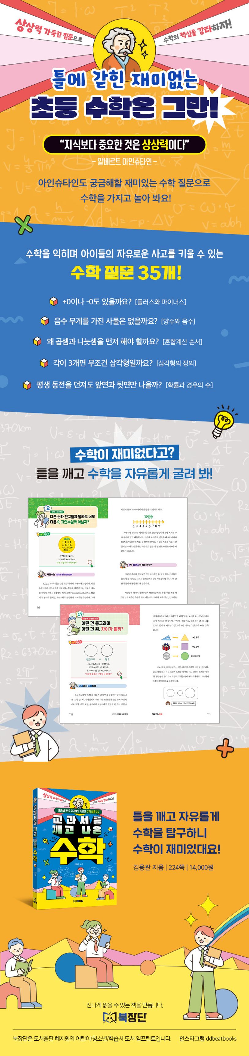 이 책은 수학 공부에 흥미를 느끼지 못하는 아이들을 위한 책입니다. 아인슈타인도 궁금해할 만한 특별한 수학 질문들을 다룬 책입니다. 암기하고, 공식만 따라야 하고, 정해진 문제를 풀기만 해야 하는 수학 공부에 아이가 흥미를 느끼지 못한다면 잠시 문제집을 덮고 이 책을 쥐어 주세요. 틀을 스스로 깨고 질문을 던지며 수학을 주도적으로 파헤칠 수 있도록 재미있는 질문들과 그에 대한 이야기로 구성했답니다.