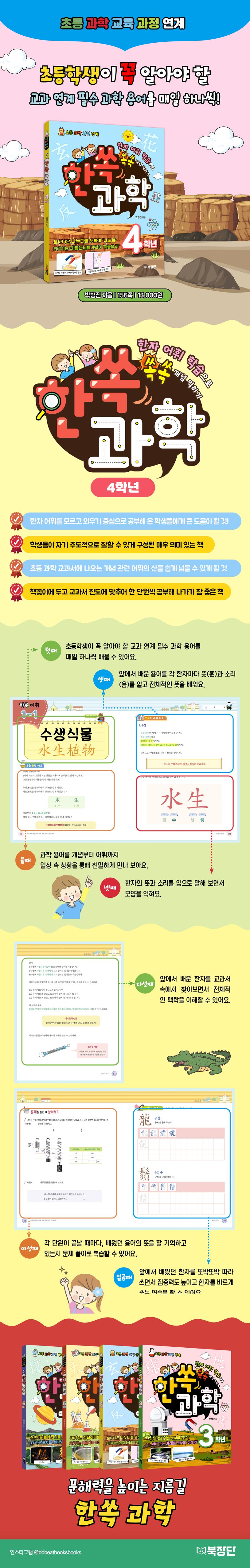 이 책은 어린이들이 과학 어휘를 잘 이해해서 교과서를 더 쉽고 재밌게 읽을 수 있도록 과학 단어가 어떤 한자를 써서 어떤 뜻인지를 익히게 합니다. 거기에 더해 배운 한자를 직접 써 보며 익힐 수 있게 했습니다. 『한쏙 과학-4학년』은 4학년 과학 교과서에 나오는 다양한 단어들을 배우며 한자 실력과 과학 성적이라는 두 가지 결실을 함께 얻을 수 있게 만든 학년별 교과 연계 학습서입니다.