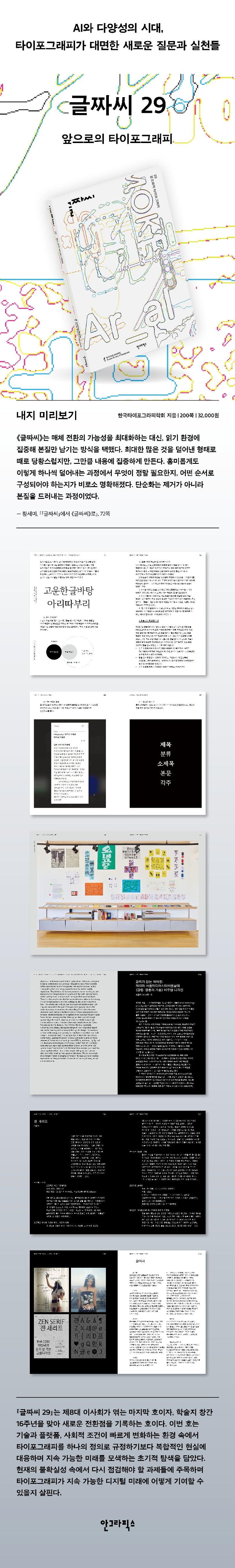 사회적 감각이자 전략적 실천의 수단으로 작동하는 양상을 담아냈다. 이번 『글짜씨 29』는 '앞으로의 타이포그래피'를 주제로, 급격한 기술 변화와 사회적 요구 속에서 타이포그래피가 나아가야 할 새로운 좌표를 탐색한다. 지난 16년간 축적해 온 물질적 기록을 디지털 환경으로 확장하는 웹 프로젝트 《글짜씨》의 과정을 공유하고, 다양성과 접근성 가이드 제정을 통해 학술 공동체가 지향해야 할 윤리적 실천의 방향을 제안한다. 인공지능과 기후 위기, 탈식민주의적 교육이라는 거시적 담론에서부터 전시와 출판에 이르는 미시적 방법론까지, 타이포그래피가 맺고 있는 다양한 영역의 변화를 다각도로 기록한다.