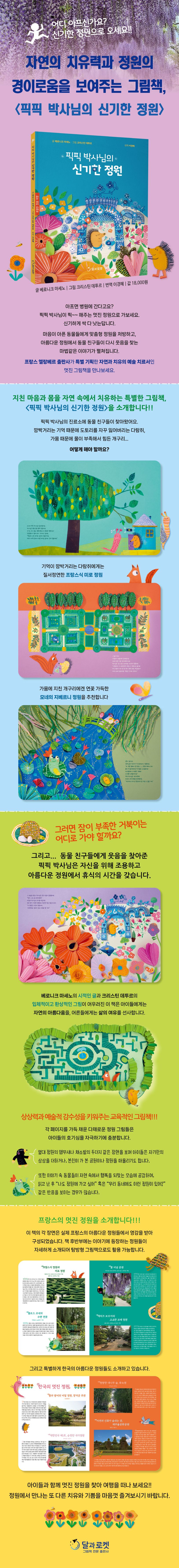 프랑스 엘랑베르 출판사가 특별 기획한 자연과 치유의 예술 치료서인 멋진 그림책을 만나보세요. 그리고...동물 친구들에게 웃음을 찾아준 픽픽 박사님은 자신을 위해 조용하고 아름다운 정원에서 휴식의 시간을 갖습니다.