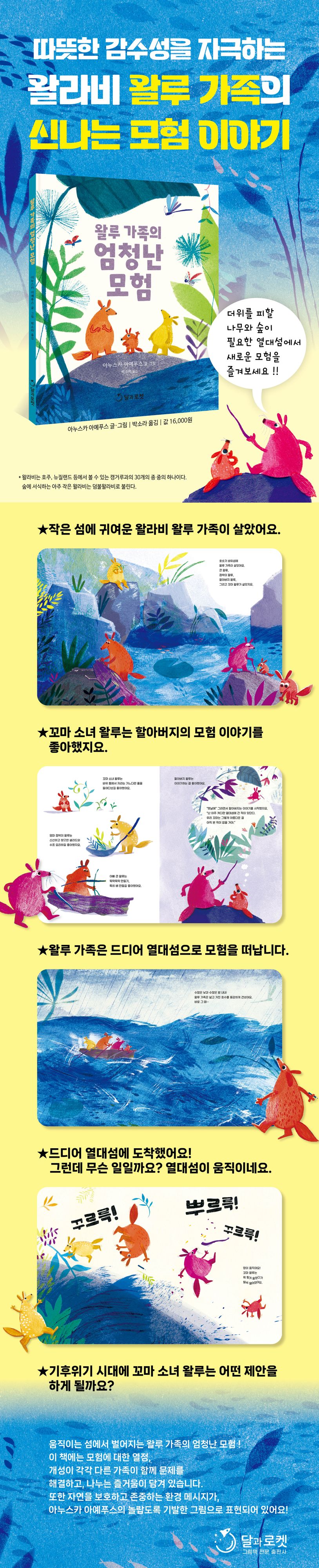 이 열대섬에서는 어떤 일이 일어날까요? 기후 위기 시대에 꼬마 소녀 왈루는 어떤 대안을 제시할까요? 작가이자 일러스트레이터인 아누스카 알레푸스는 우리 주변의 자연과 생물에 대한 따뜻한 감수성을 자극하는 왈루 가족의 재미있는 이야기를 들려줍니다. 표지와 책 전체에 다채롭고 상세한 그림이 가득하고, 귀여운 왈라비 왈루 캐릭터가 재미있게 이야기를 이끌어 갑니다. 유머가 풍부하고, 마음이 따뜻해지는 이야기여서 자꾸자꾸 읽고 싶어지는 그림책입니다. 책장을 넘기다 보면 우리는 자연을 보호하고 존중하는 사랑스러운 메시지에 어느덧 스며들게 되지요.