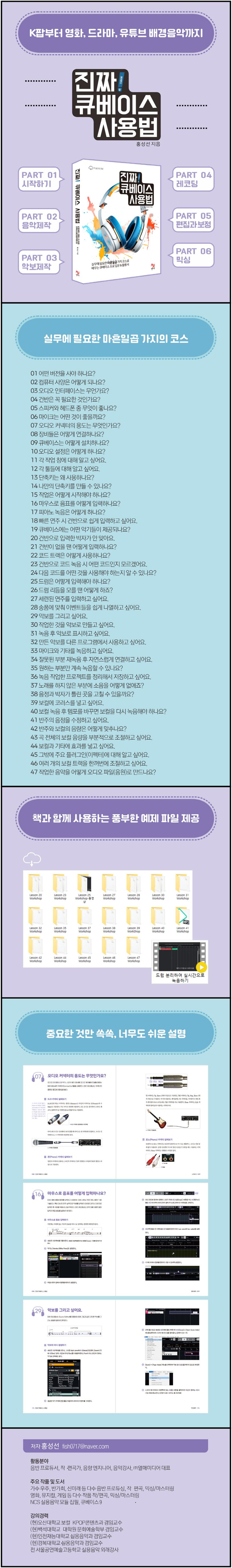 진짜! 큐베이스 사용법은 음악을 만들기 위한 작곡, 편곡, 믹싱, 마스터링 작업이 가능한 DAW로써 큐베이스를 처음 접하는 입문자와 초보자, 작 · 편곡가, 싱어송라이터, 음악대학교 전공자, 수업 및 레슨의 지도자와 학습자 등 큐베이스의 기초를 쉽게 배우고 싶어 하는 모든 분들에게 최적화된 도서이다.