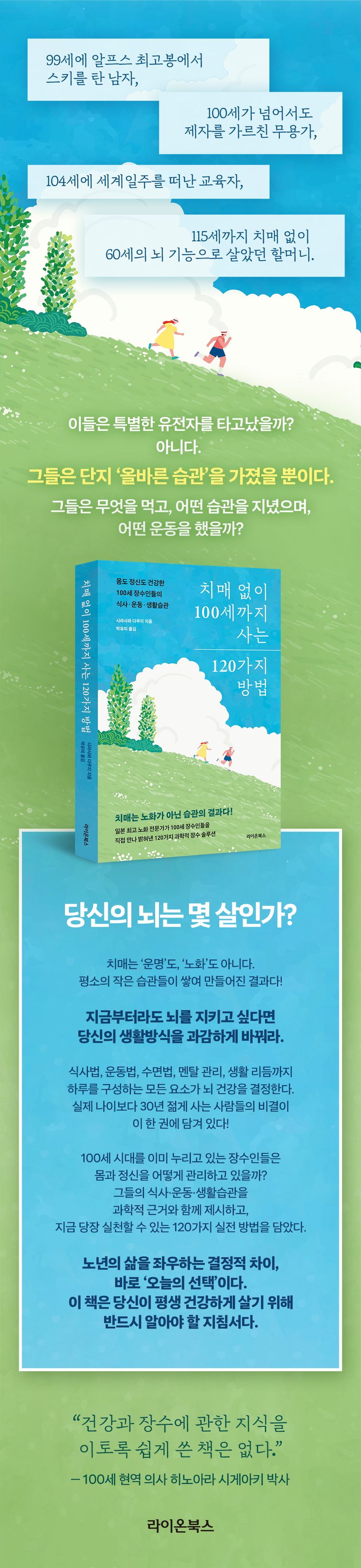 없다. 치매에 걸리지 않으면 장수할 수 있다. 일상 속에서 치매에 걸리지 않도록 노력하면 수명을 연장하는 길로 이어지는 것이다. 이제 백세인도 꿈이 아닌 시대가 됐다. 지금 당장 누구나 할 수 있는 쉽고 부담 없는 120가지 실천법이 책에 자세히 담겨 있다. 치매 없는 인생을 위해 일단 한 가지라도 시도해 보자.