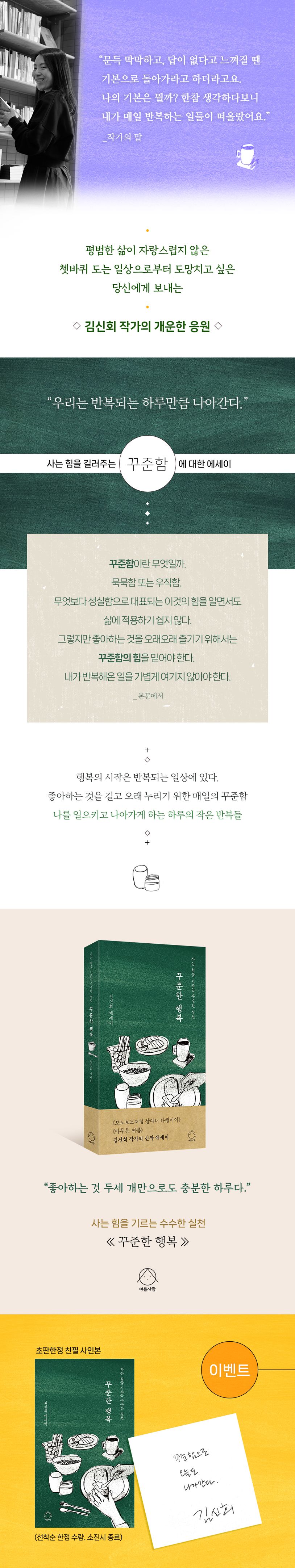 《꾸준한 행복》에는 18년 동안 글을 써온 전업 작가이자, 반려견 ‘풋콩이’의 보호자, 비혼 여성으로서 일궈온 하루하루가 담겨있다. ‘작지만 소중한 일상의 의미’를 전하기 위해 매일 쓴 짧은 에세이를 모아 한 권으로 엮었다. 바쁜 일상으로 책 읽을 시간이 부족한 독자들도 부담 없이 읽을 수 있도록 한 편 한 편 완결되는 에세이이자, 활자 읽기가 익숙지 않은 사람에게도 어느새 ‘책장을 넘기는 즐거움’을 느끼게 하는 독특한 구성이 돋보인다.