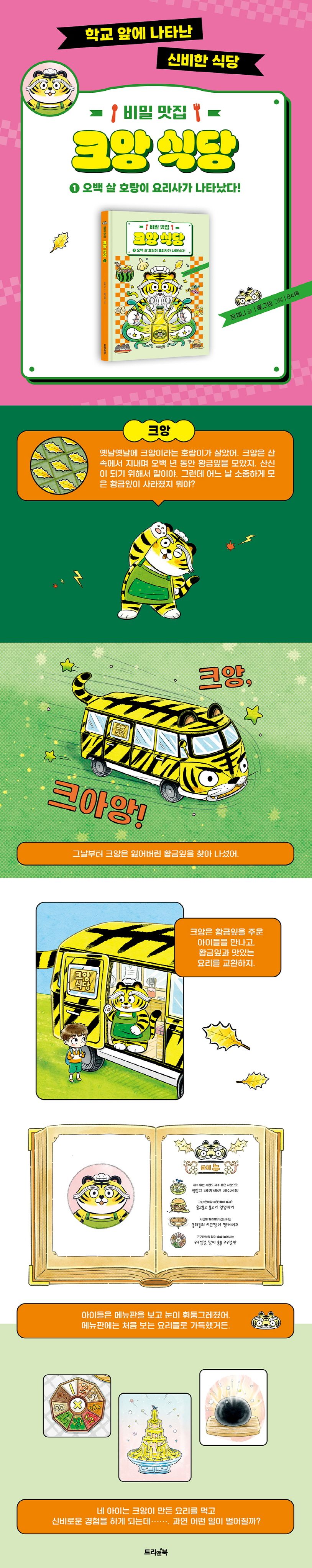 옛날옛날에 크앙이라는 호랑이가 살았어. 크앙은 산속에서 지내며 오백 년 동안 황금잎을 모았지. 산신이 되기 위해서 말이야. 그런데 어느 날 소중하게 모은 황금잎이 사라진 거야. 크앙은 푸드 트럭을 몰며 황금잎을 찾아 나섰어. 어, 저기 한 아이가 황금잎을 주웠어. 과연 어떤 일이 벌어질까?