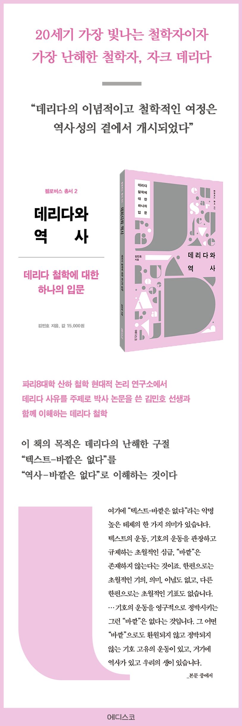 데리다를이런시선으로보면이책의제목이기도한‘데리다와역사’의조합은어울리지않아보인다.그러나이책의저자김민호선생은데리다의‘해체’개념은근본적으로또다른역사성을사고하는문제였으며“데리다의이념적이고철학적인여정은역사성의곁에서개시”되었다고말한다.세간의오해와달리데리다사상에서역사개념이중요한위치를차지하고있다는얘기다.