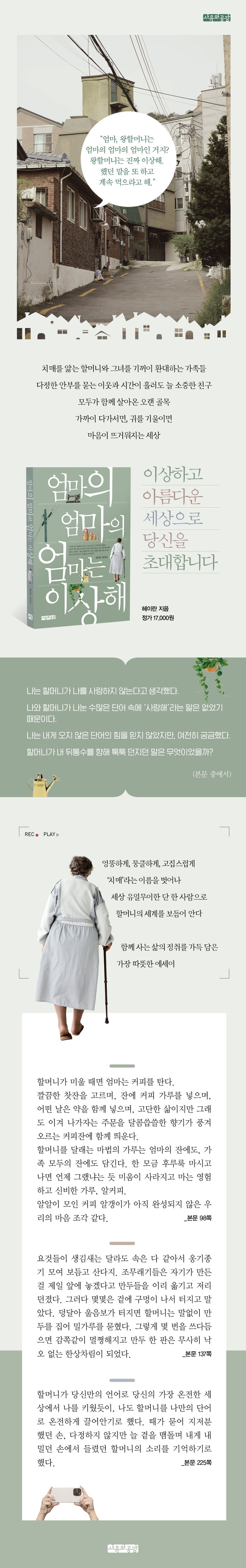 《엄마의 엄마의 엄마는 이상해》의 저자 헤이란은 날이 갈수록 희소해지고 있는 대가족의 구성원이다. 그가 사는 집에서 멀지 않은 곳에 저자의 엄마가 할머니를 보살피며 사는 외갓집이 있다. 치매를 앓고 있는 그의 할머니는 어느 순간에 기억이 멈춘 채로 고요한 하루하루를 보내고 있지만, 끊임없이 같은 말과 행동을 반복하고 자신에게만 들리는 목소리와 대화를 나누며 때로는 저승사자 저리 가라 할 만큼 지독한 분노를 쏟아내는 도깨비가 되기도 한다. 저자는 자신에게 사랑한다고 말해주지 않는 할머니를 오랜 시간 미워했지만, 다시금 할머니만의 ‘사랑’의 언어를 이해하고자 그를 관찰하고, 기록하고, 받아들이기 위해 노력한다.