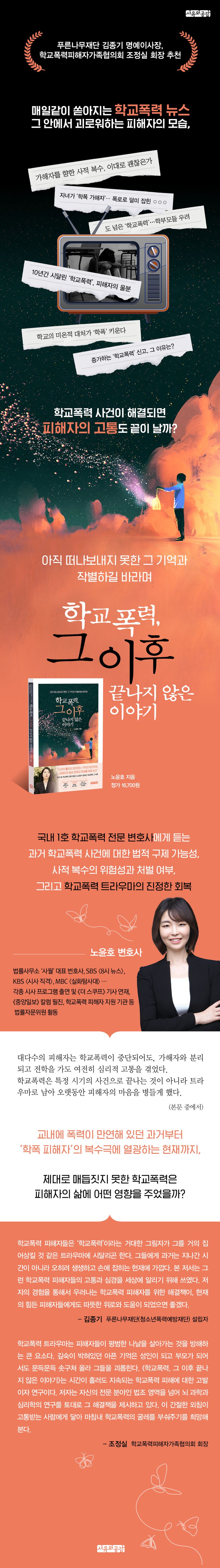 2023년은 '학폭 미투'와, 넷플릭스 드라마 〈더 글로리〉 열풍, 정치적으로 불거진 학교폭력 논란 등 그 어느 때보다 학교폭력에 대한 문제의식이 강해진 해였다. 이러한 가운데 저자 노윤호는 가해자에 대한 처벌에 가려져 상대적으로 주목받지 못하고 있는 피해자의 회복, '학교폭력 트라우마'의 극복이라는 주제에 대해 신간 《학교폭력, 그 이후 끝나지 않은 이야기》를 통해 그 본상을 밝히고 해결 방법을 찾았다.