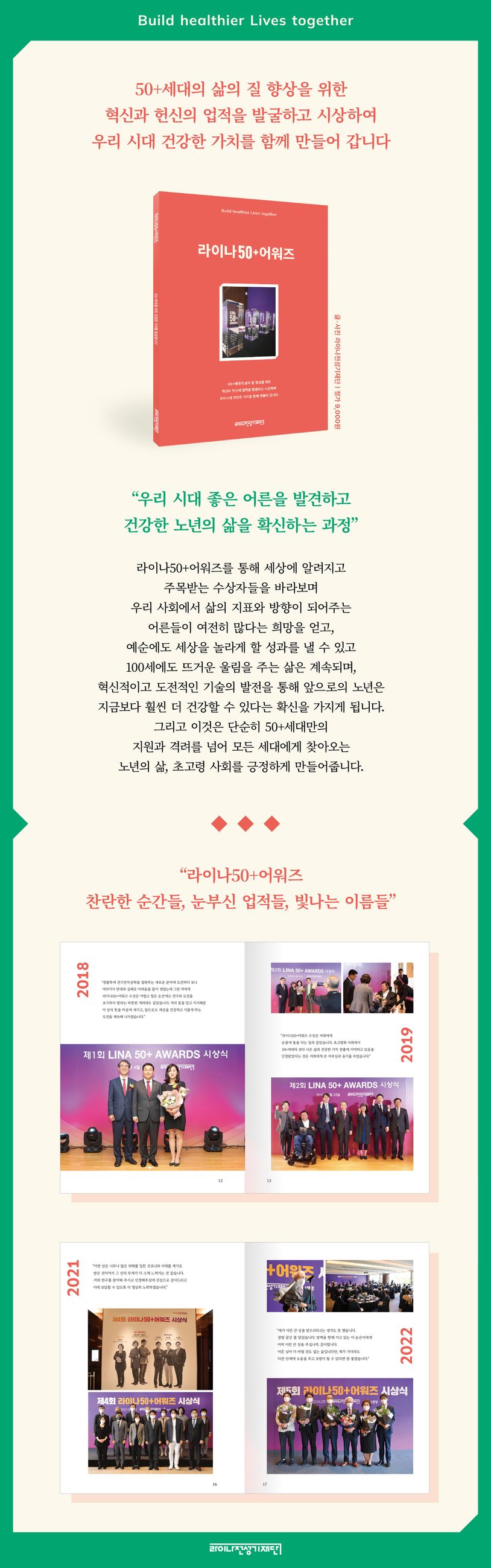 라이나50+어워즈는 50+세대의 삶의 질 향상을 위한 사회 공헌 활동 및 업적, 아이디어 등을 발굴 시상함으로써 건강한 사회적 가치를 창출하고 혁신과 헌신을 통해 50+세대에 기여합니다.