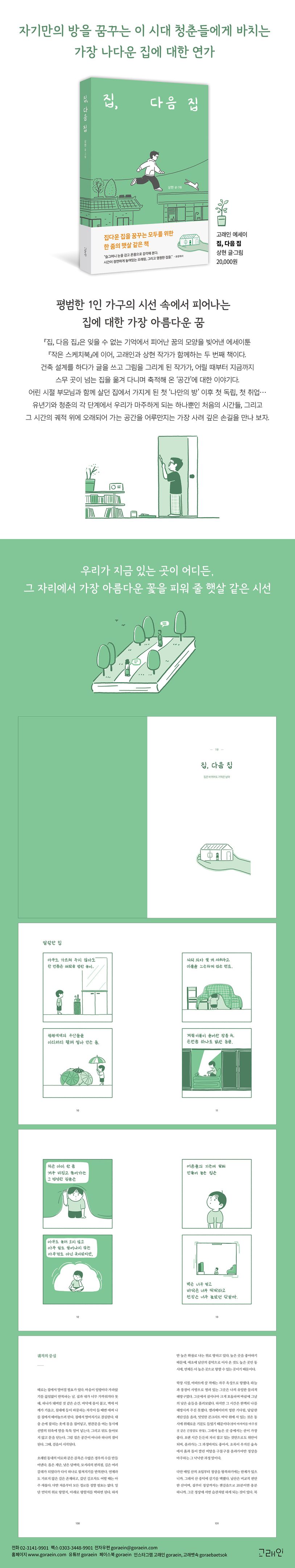 『집, 다음 집』은 잊을 수 없는 기억에서 피어난 꿈의 모양을 빚어낸 에세이툰 『작은 스케치북』에 이어, 고래인과 상현 작가가 함께하는 두 번째 책이다. 눈으로도 만져지는 듯한 단정한 다듬새, 안팎의 크고 작은 모서리들을 둥글게 어루만지는 시선, 체에 거르듯 곱게 걸러낸 듯한 글과 그림의 조각들… 작가의 지문과도 같은 이야기의 모양이 이번에도 어김없이 책장 구석구석 담겨 또 한 채의 집을 이루었다. 『집, 다음 집』은 건축 설계를 하다가 글을 쓰고 그림을 그리게 된 작가가, 어릴 때부터 지금까지 스무 곳이 넘는 집을 옮겨 다니며 축적해 온 ‘공간’에 대한 이야기다. 어린 시절 부모님과 함께 살던 집에서 가지게 된 첫 ‘나만의 방’ 이후 첫 독립, 첫 취업… 유년기와 청춘의 각 단계에서 우리가 마주하게 되는 하나뿐인 처음의 시간들, 그리고 그 시간의 궤적 위에 오래되어 가는 공간을 어루만지는 가장 사려 깊은 손길을 만나 보자.