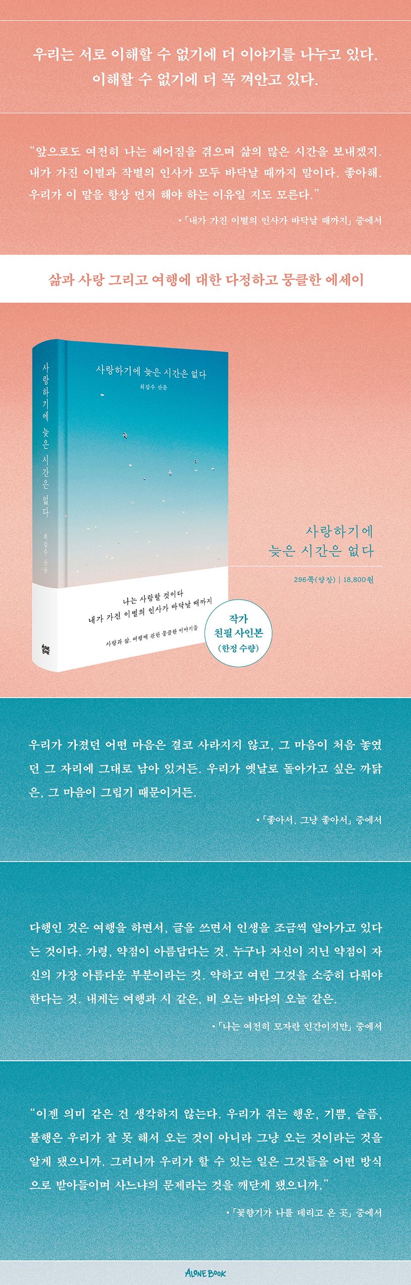 『우리는 사랑 아니면 여행이겠지』 『밤의 공항에서』 『음식은 맛있고 인생은 깊어갑니다』 등을 펴내며 특유의 섬세하고 투명한 문장으로 여행과 인생, 사랑과 위로의 감정을 그려낸 작가의 신작 산문집 『사랑하기에 늦은 시간은 없다』를 출간한다.