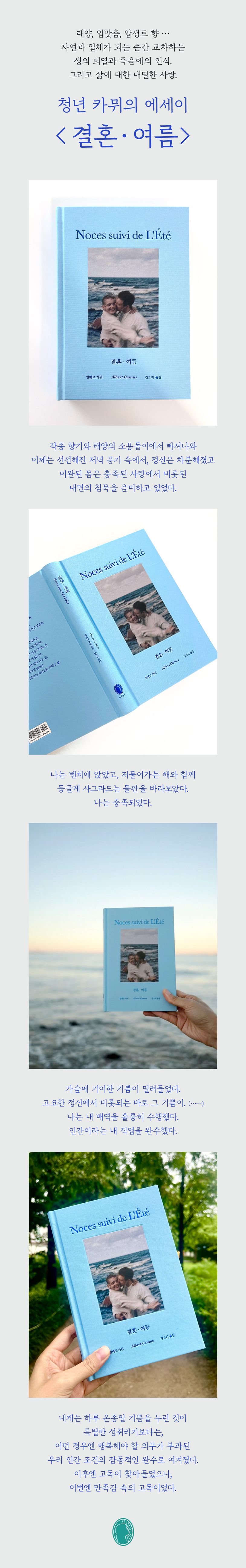『결혼 · 여름』은 카뮈 사상의 핵심인 ‘부조리’와 ‘반항’의 출발 및 완성 과정이 육성으로 들리는 듯한 자전적 기록이다. 하지만 수많은 이들을 벅차 오르게 했던 『결혼 · 여름』의 가장 큰 매력은 감각적이며 관능적인 문체다. 드물게 시와 사상, 예술과 철학이 완벽하게 결합된 에세이가 우리에게 닿았다.
